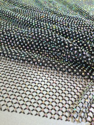 Эластичная сетка черная со стразами AB SS10, плотность 590 гр/м, ширина 1,1м